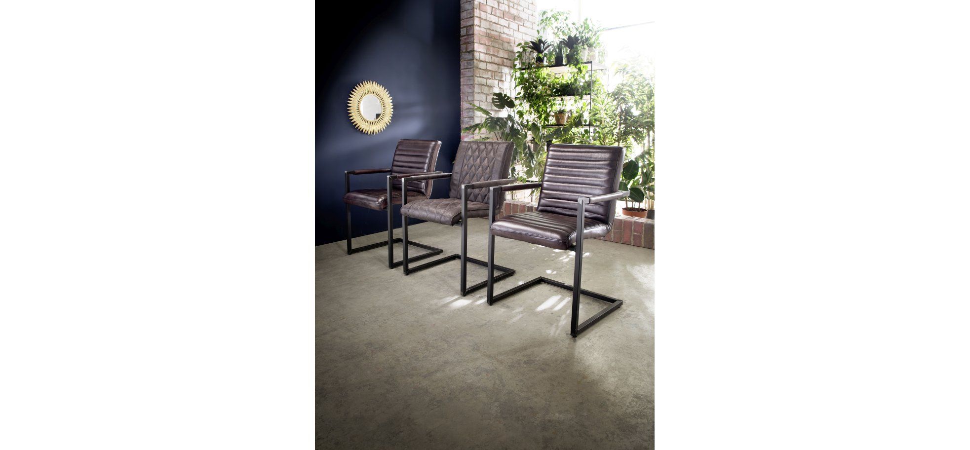 Der bequeme Armlehnstuhl Cambridge überzeugt mit einem hohen Sitzkomfort und industriellem Design. Das vierkantige Gestell bildet dabei die hochwertige Basis des Stuhl auf dem die Sitzfläche mit der auffälligen Steppung ihren Platz findet. Durch den antiken Schliff des Gestells bekommt der Stuhl einen natürlichen Vintage-Touch.