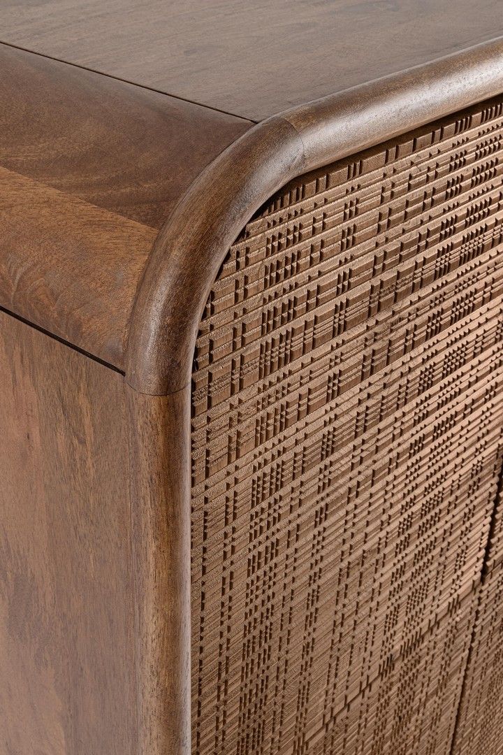 Das Highboard BIELA ist gefertigt aus massivem Mangoholz. Die 4 Türen sind mit aufwendigen Intarsien verziert und der Stauraum dahinter bietet viel Platz für Geschirr, Bücher oder Alltagsgegenstände.