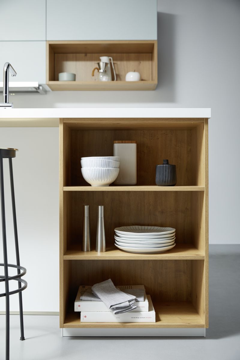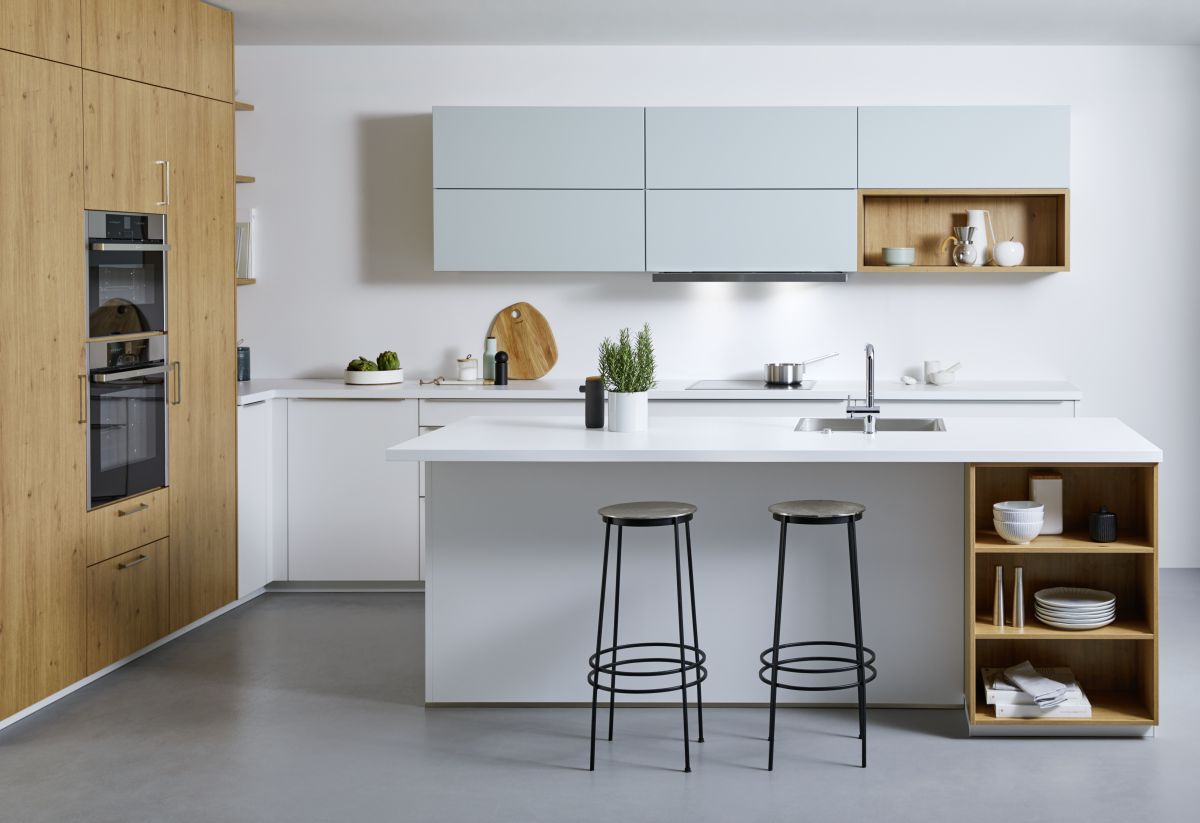 Küchenzeile Glas Kristallweiß matt, Satinlack Gletscherblau, Assteiche natur Nachbildung