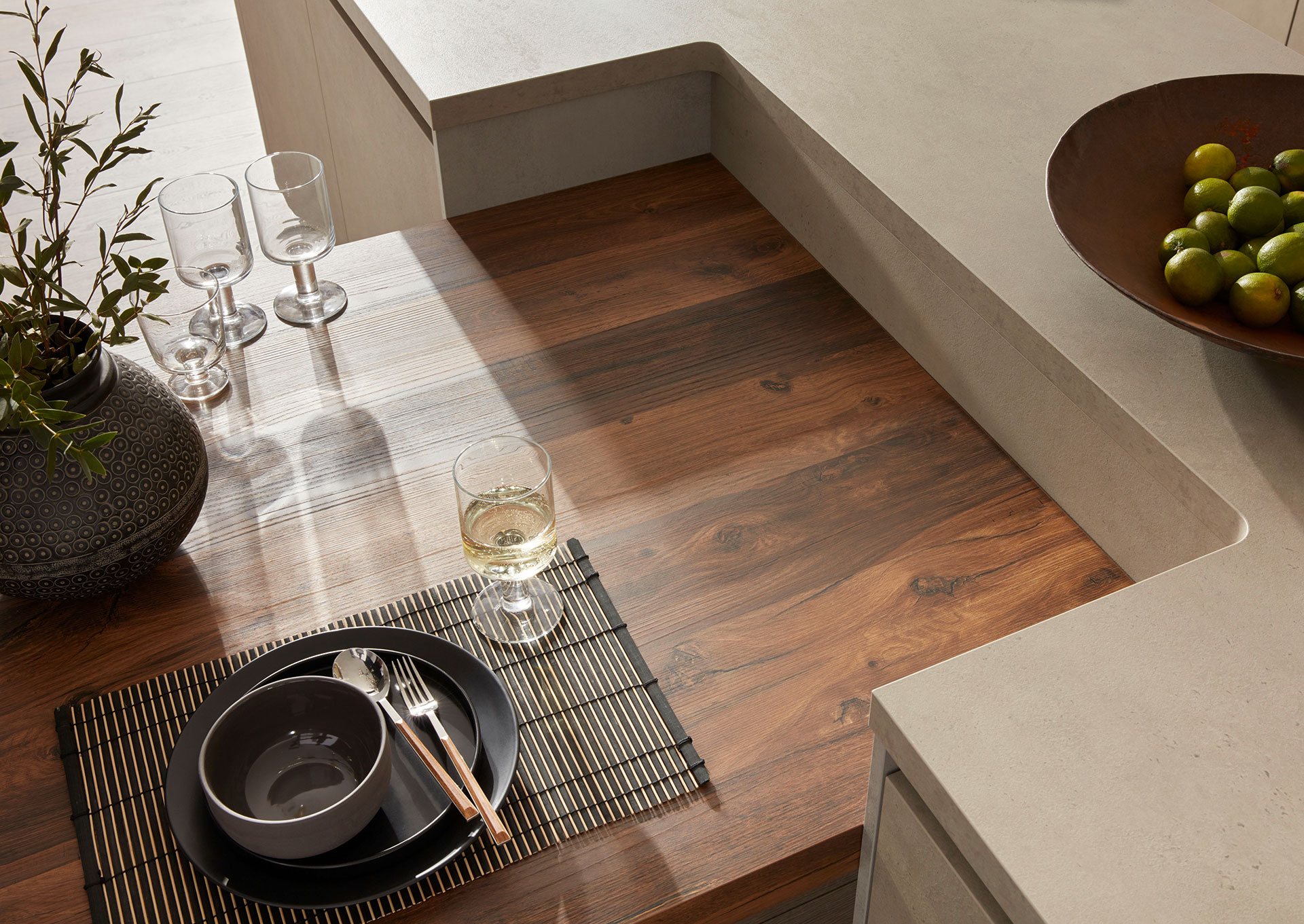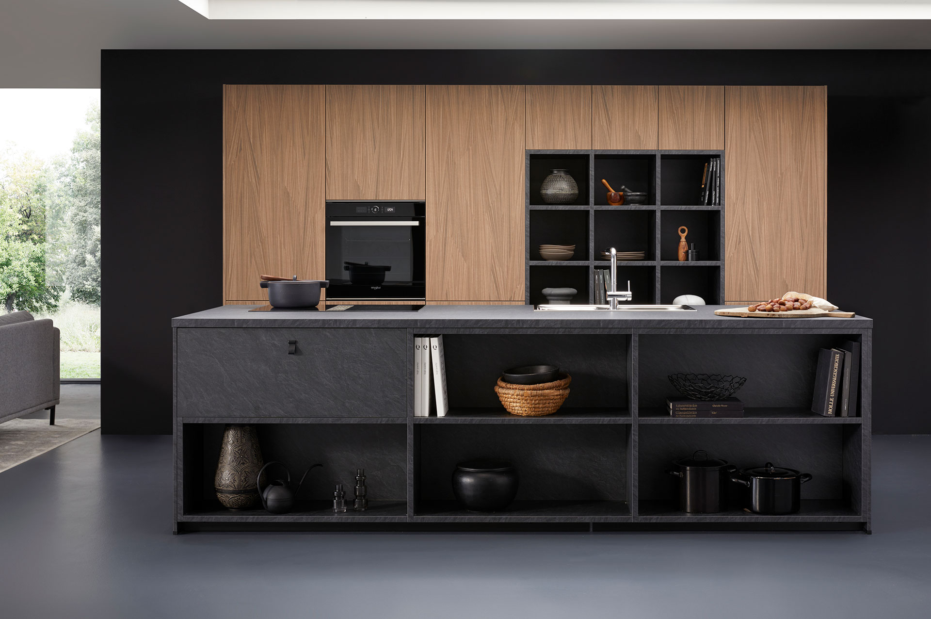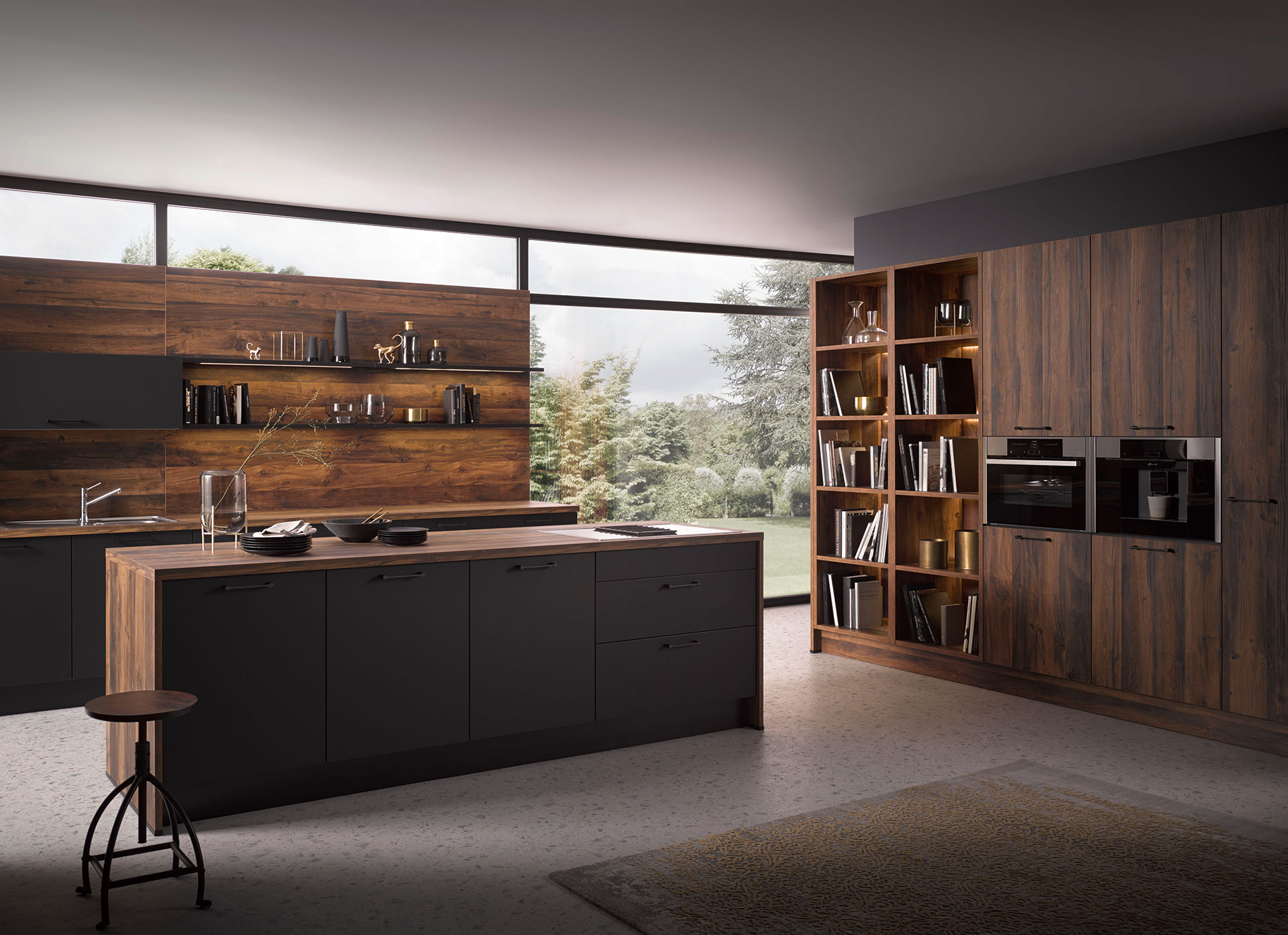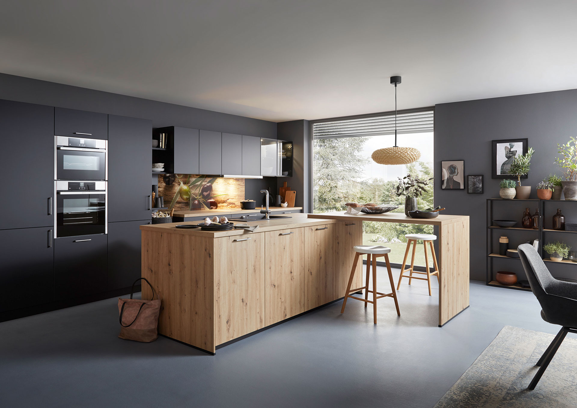 Hier wird bewiesen, mit welcher Wärme schwarze Küchen inszeniert werden können. Die Insel mit Theke in Wildeiche natur Nachbildung bereichert die moderne Ästhetik der Küchenzeile in mattem Onyx schwarz mit natürlichem Charme.