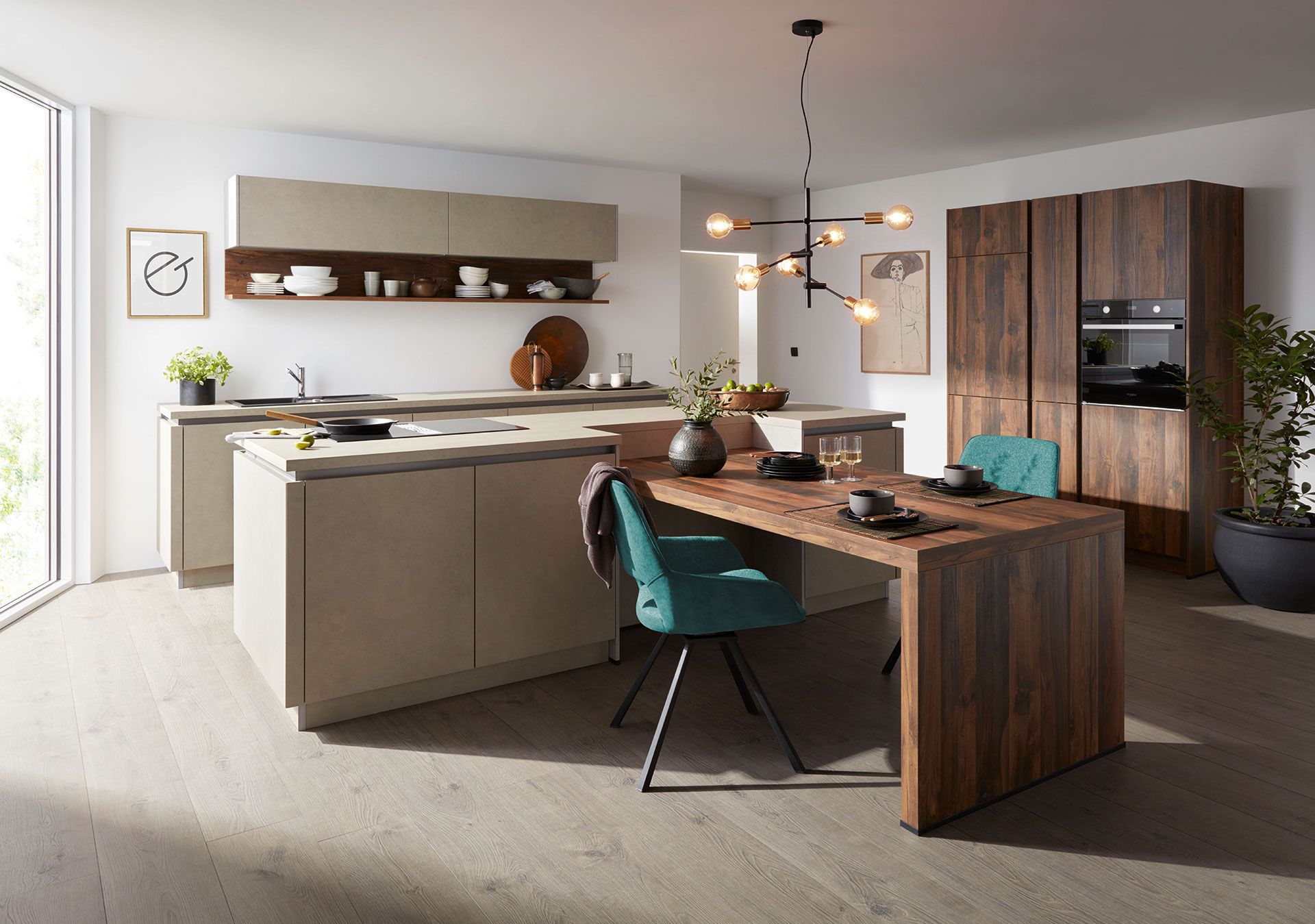 Küche CONTORNO   Kombination mit Beton Nebelgrau Nachbildung und Flammeiche schwarz Nachbildung Masse Hochschränke ca. B 382 cm Mass Technikschrank ca. B 250 cm Masse Insel ca. 365 cm Preis ohne Elektrogeräte, Spüle und Armatur Gerne stellen wir Ihnen ein individuelles Geräteset zusammen!