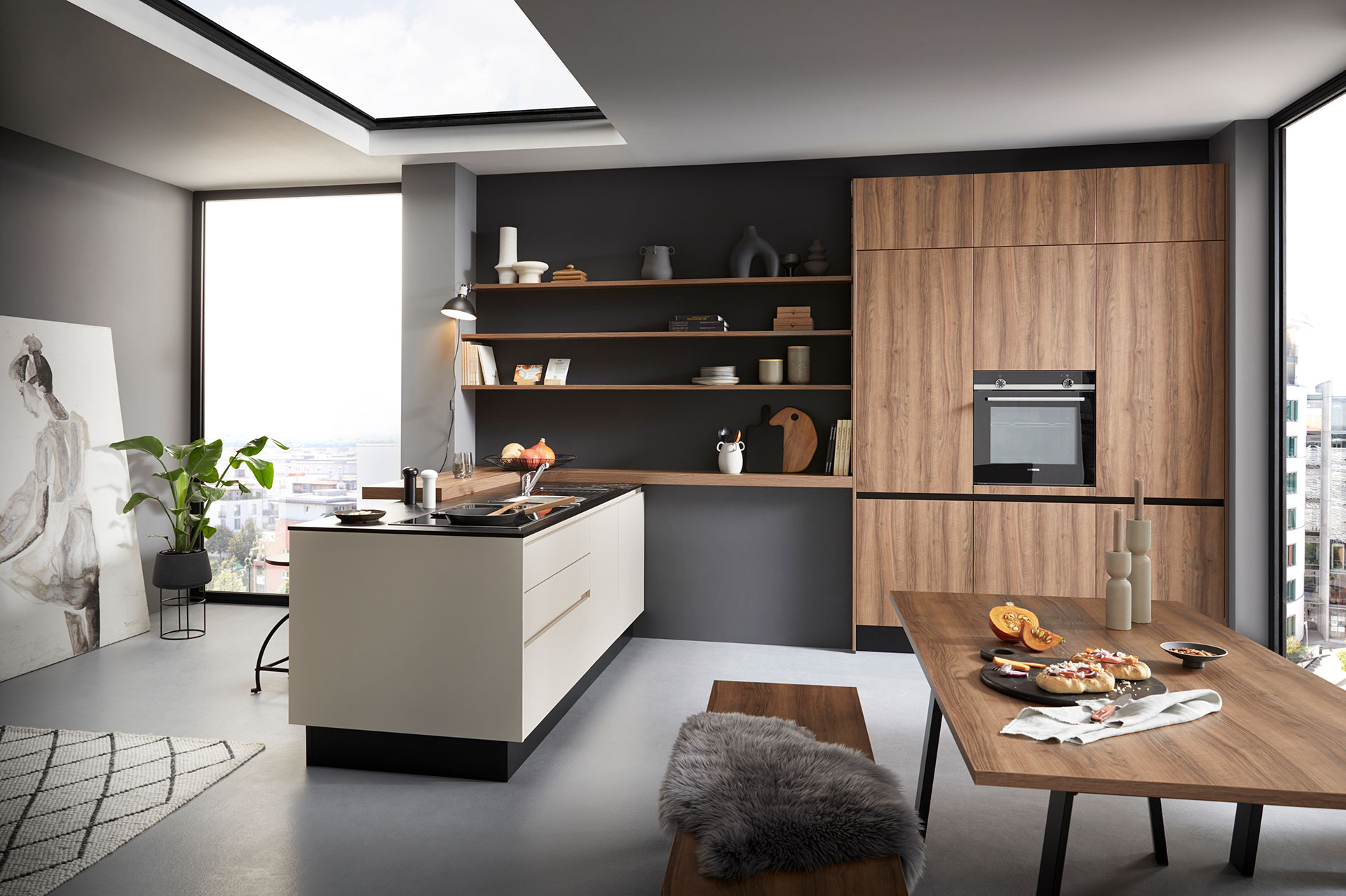 Die Linienführung bei dieser Küche ist klar und im modernen Minimalismus. Durch die harmonische Farbkombination aus Muschelweiß und Nussbaum Nachbildung ist der Wohlfühlfaktor gesetzt.