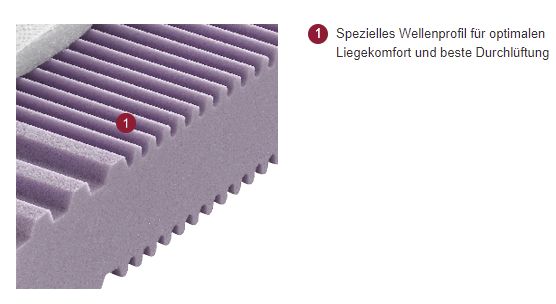 ehm trockenes Schlafklima. Dank feiner Einschnitte im sensiblen Schulterbereich sinkt der Körper bei Seitenlage perfekt ein. Das hier verwendete Wellenprofil bietet darüber hinaus einen spannungsfreien Liegekomfort und erhöht die Durchlüftung der Mat
