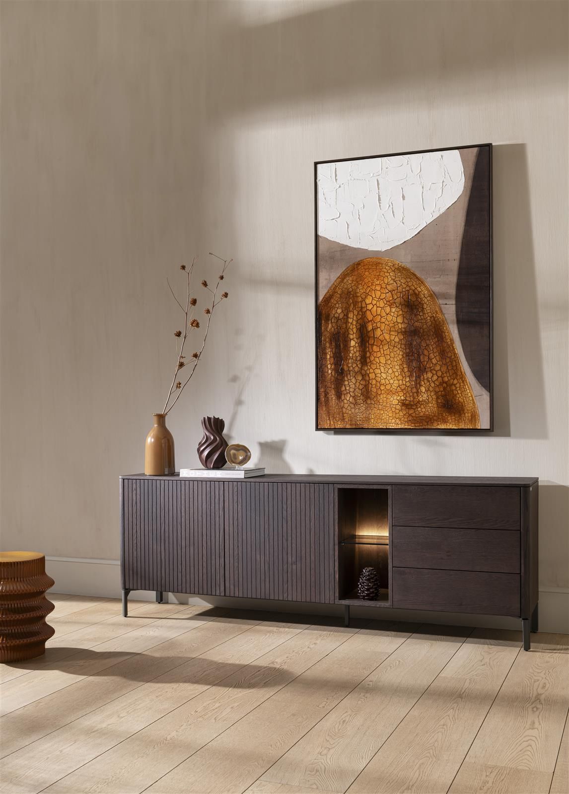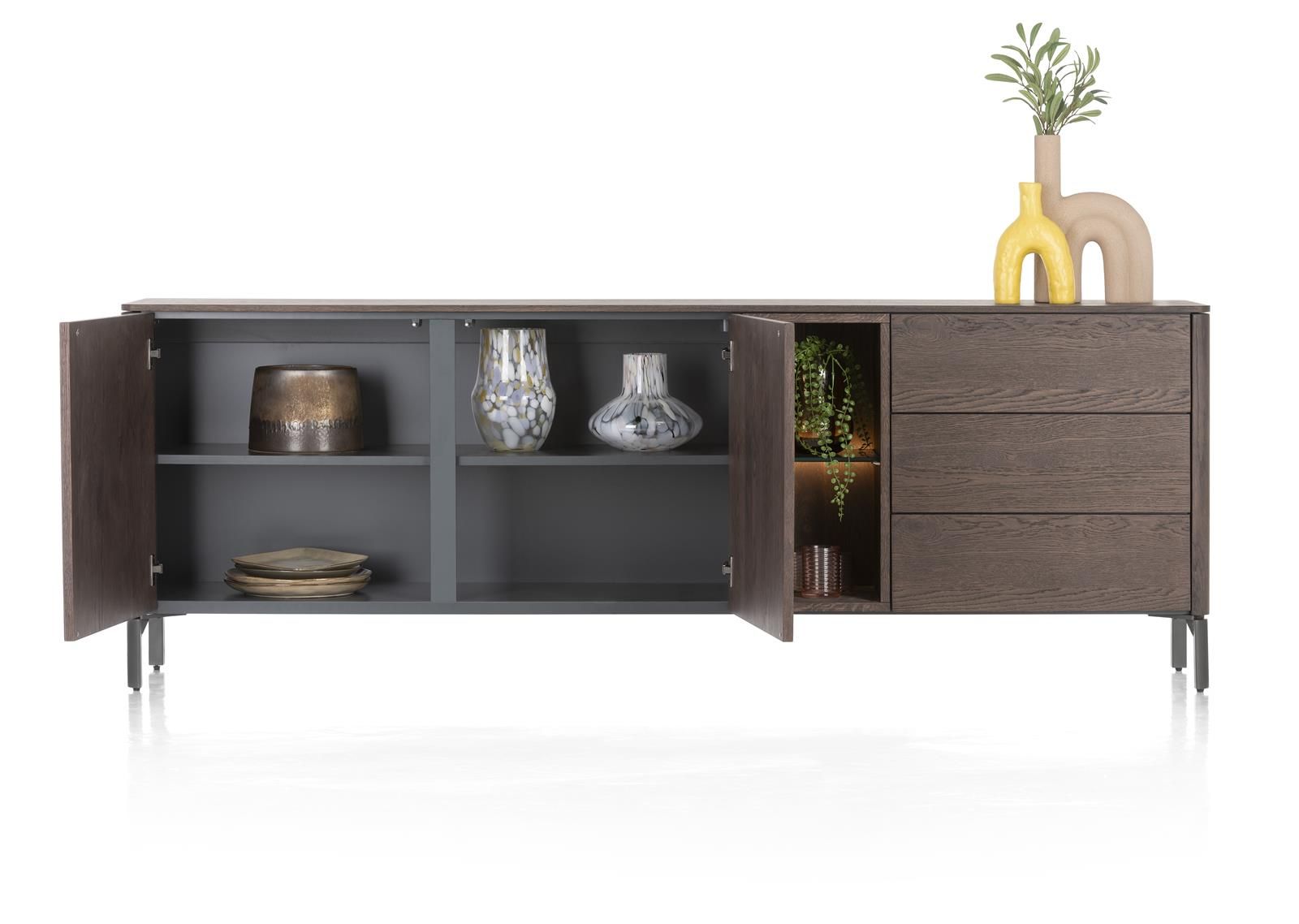 TRENTON ist aus Eichenfurnier, das Gestell ist aus Metall in der Farbe Graphit. Die abgerundeten Ecken durchbrechen die klaren Linien in deinem Interieur. Das Lamellenmuster in den Türen erzeugt einen verspielten Effekt. TRENTON ist 211 cm breit und verfügt über 2 Türen + 3 Schubladen + 2 offene Fächer. Das Sideboard ist mit einem praktischen Push-to-Open-System ausgestattet und die offenen Fächer sind LED-beleuchtet!